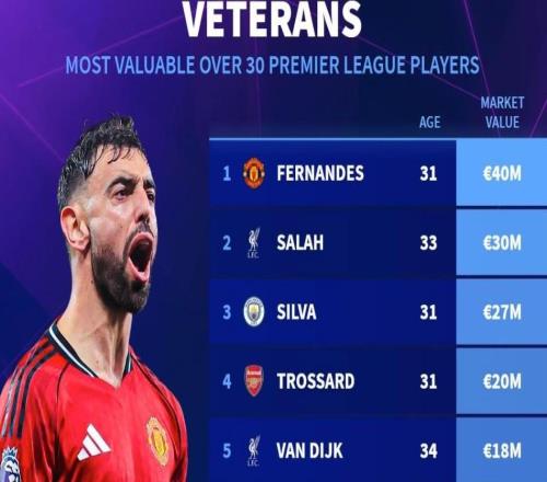 英超30岁以上球员身价榜:B费4000万欧第1,萨拉赫3000万第2 -